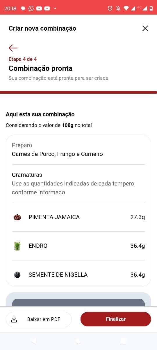 4) Passo: Pronto! O Aplicativo vai indicar a gramatura exata de cada tempero para harmonizar e ensinar como preparar a mistura seca, em pasta ou sal temperado. Agora é só salvar sua receita e baixar em PDF.