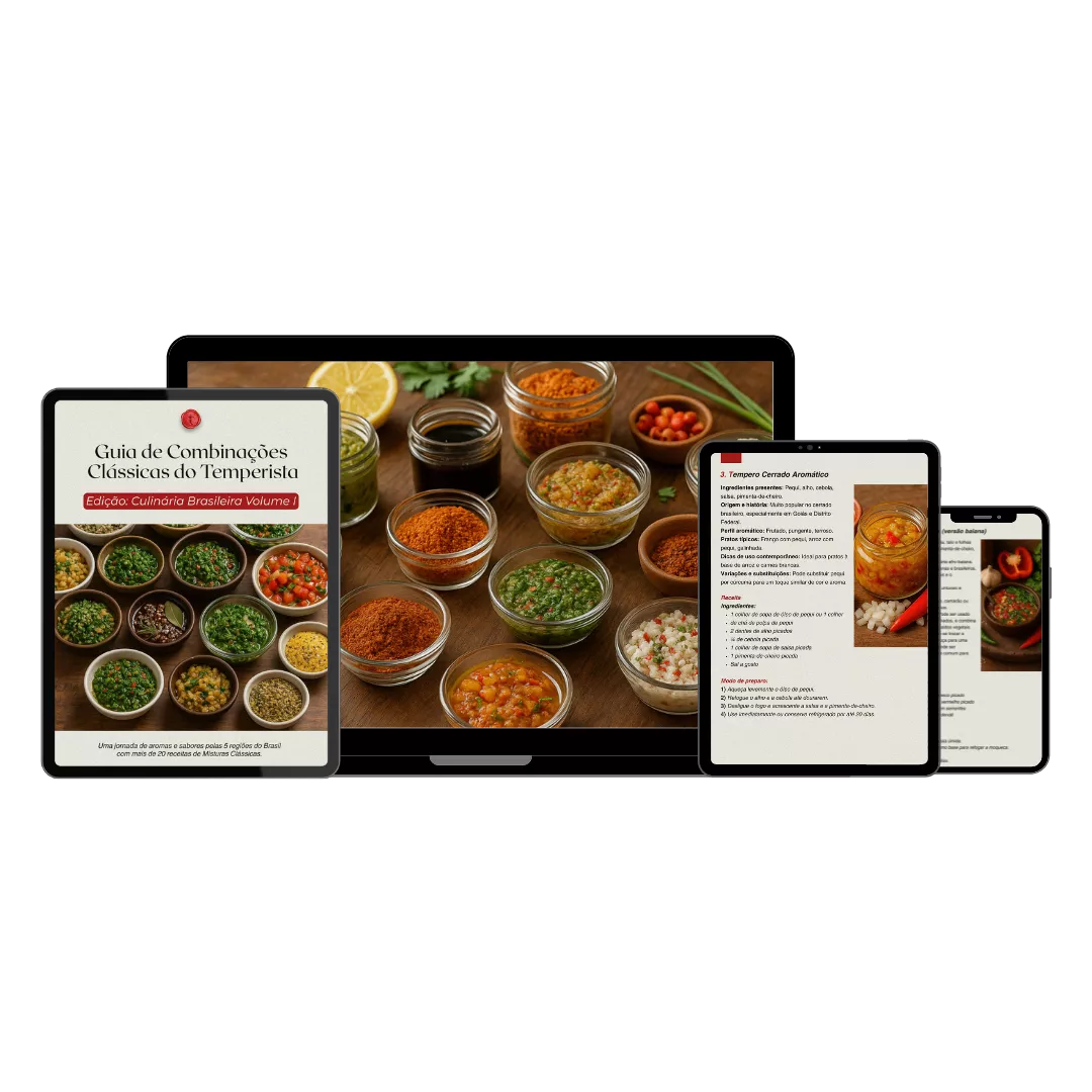 Um eBook didático que te ensina 30 Combinações de Temperos Brasileiras e formas de aplicar elas no seu dia a dia, incluindo indicações para substituição de ingredientes.